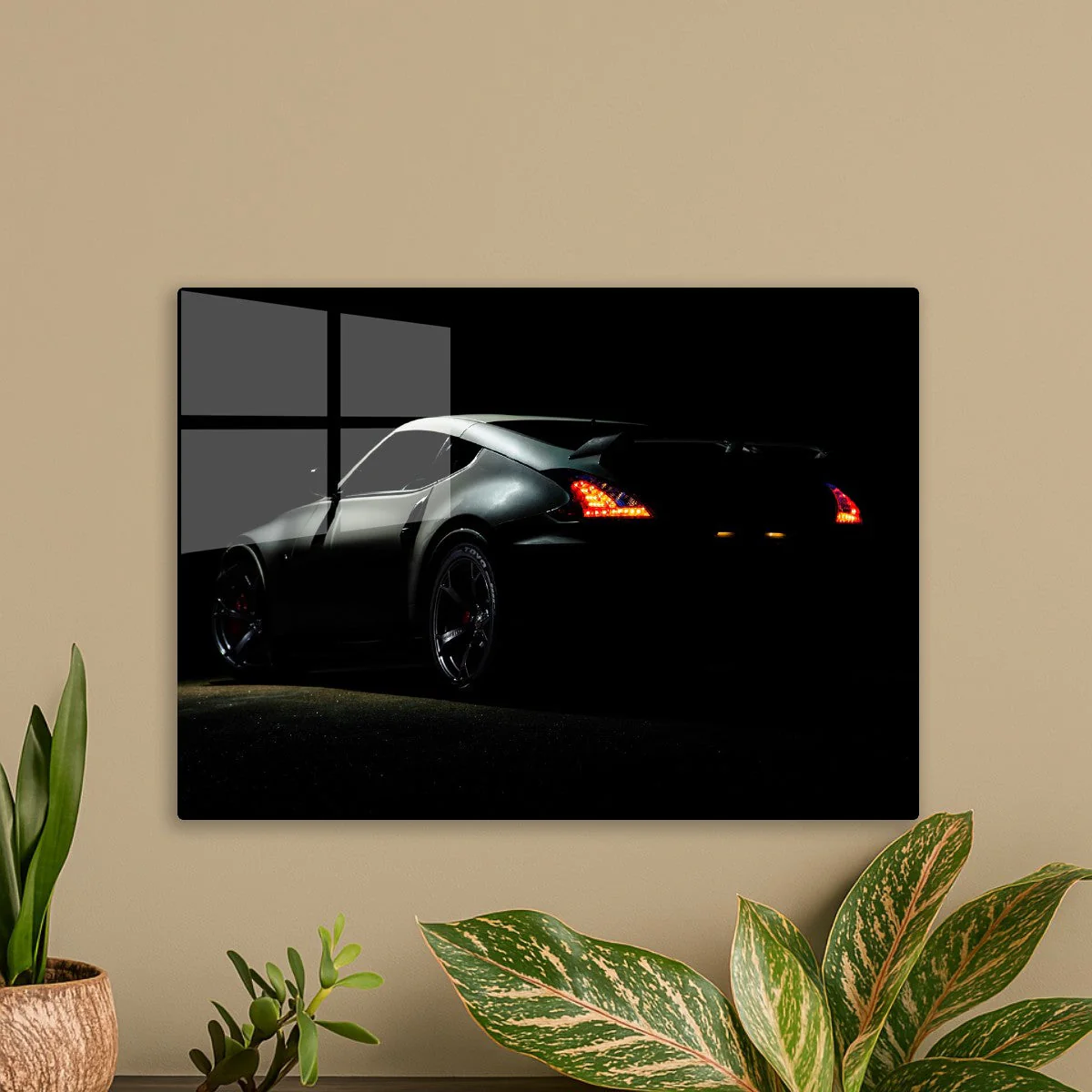 A dramatic low-key shot of a dark Nissan 370Z sports car with illuminated LED taillights