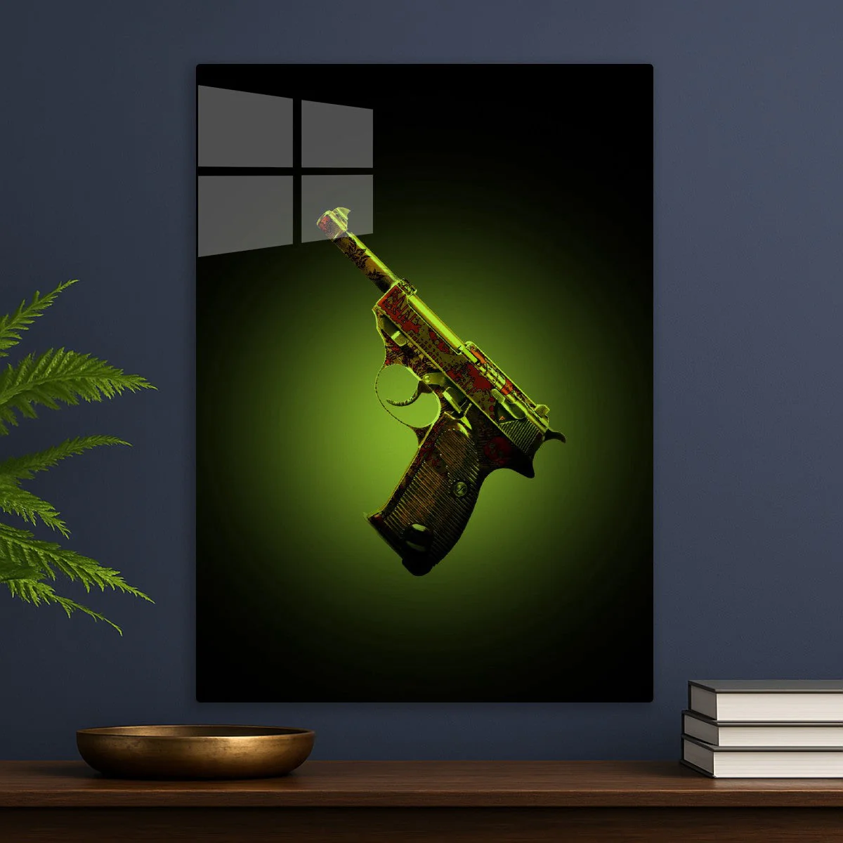 An elegant Beretta 92FS pistol with intricate red and gold floral engravings on a gradient green background.