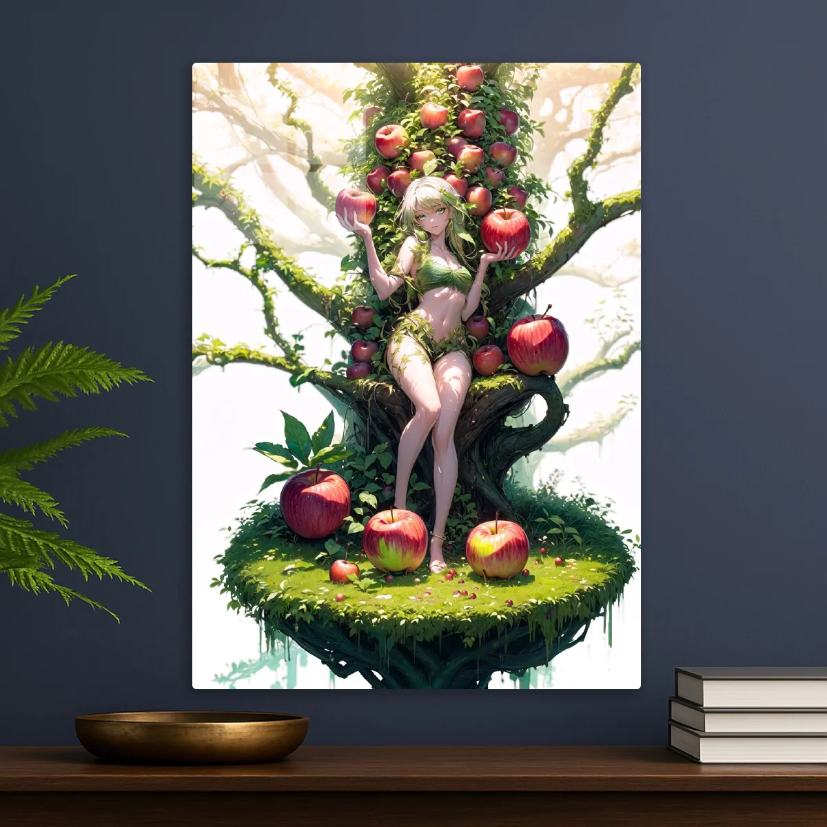 A young woman with green hair standing at a tree surrounded by apples. A revealing red and green outfit with intricate patterns.
