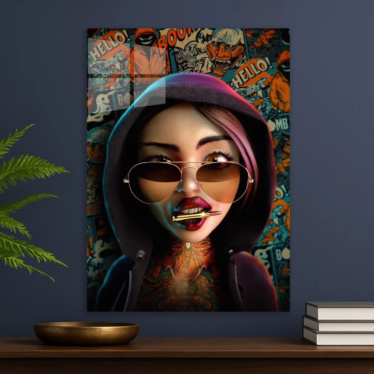 A striking 3D portrait of a hooded woman with aviators, red lips, and a bullet in her mouth, set against a vibrant graffiti backdrop.