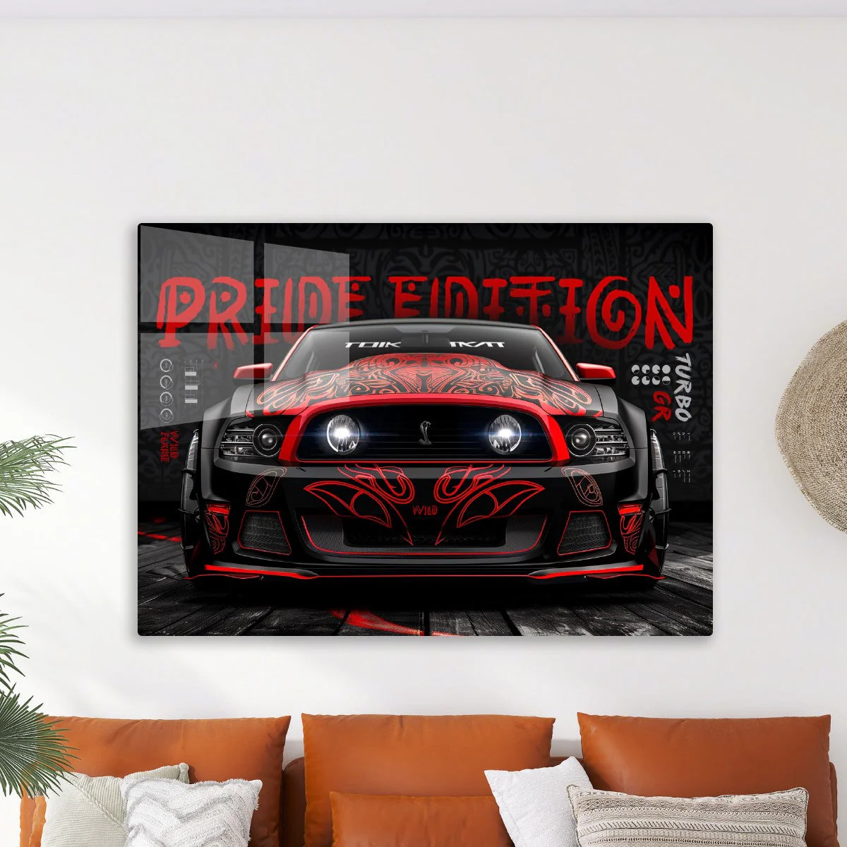 An overhead view of a custom black Ford Mustang adorned with intricate red tribal-like designs across its hood and front bumper.